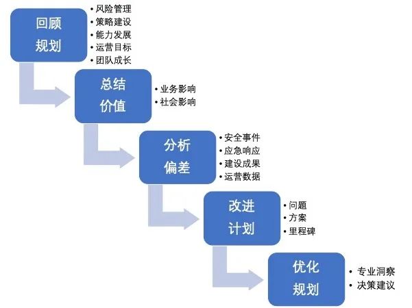 对于偏差的总结未必都是需要改进的部分,对于做的好的部分,成绩可以阐述,但是关键存在负面偏差的部分,重点要有改进计划,要清晰的表明存在的问题,是因为专业度不够,资源投入不足,技术决策错误,项目管理不足所引起的未达到预期的目标,都需要有明确的方案,和改进的关键里程碑。这是体现安全团队闭环管理和执行力的关键,要做到事事有跟进,事事有结果。