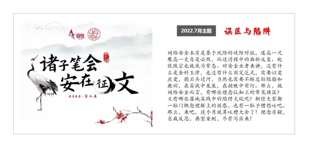 自2022年5月起,“诸子笔会第二季”正式拉开帷幕。经过对首届活动复盘,我们在坚持大原则、大框架、主体规则基础上,优化赛制特别是奖项设置和评奖方式。13位专家作者组成首批“笔友”,自拟每月主题,在诸子云知识星球做主题相关每日打卡,完成每月一篇原创。除了共同赢取10万元高额奖金,我们更要聚焦甲方关注,发掘最佳实践,弘扬分享精神,实现名利双收。本期发文,即诸子笔会月度主题来稿之一。