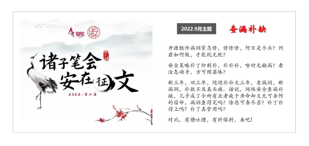 在讨论9月主题的时候,社群里两个大佬精彩地对了一副对联:“开源组件漏洞紧急修,修修修,何日是个头,问君如何做,才能枕无忧;安全策略补丁即刻补,补补补,今朝提重议,看汝怎谏言,方可处安泰。”如此一来,就形成了“查缺补漏”的9月主题。