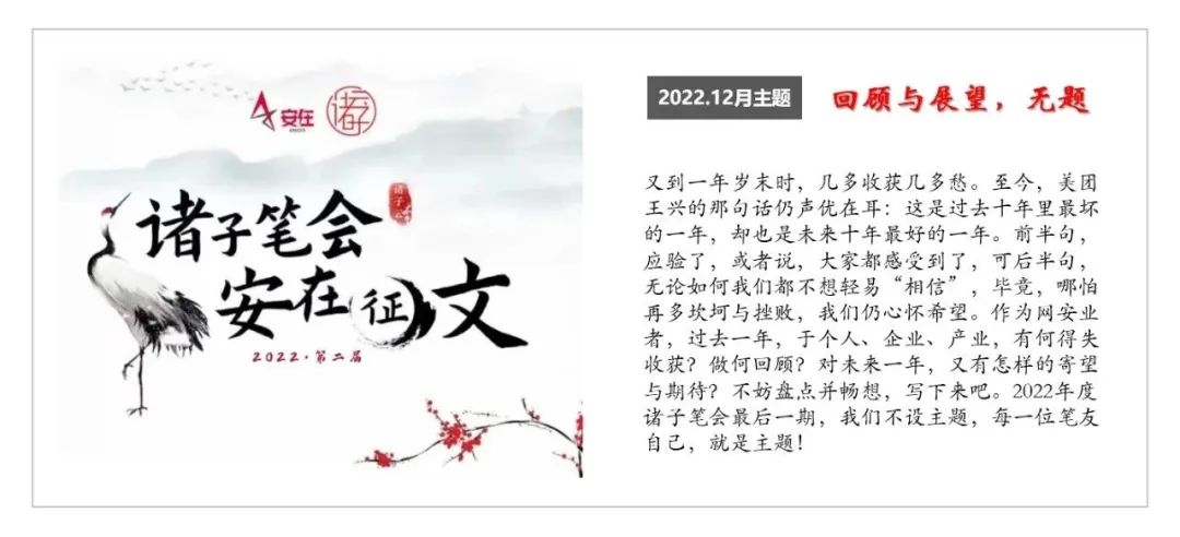 自2022年5月起,“诸子笔会第二季”正式拉开帷幕。经过对首届活动复盘,我们在坚持大原则、大框架、主体规则基础上,优化赛制特别是奖项设置和评奖方式。13位专家作者组成首批“笔友”,自拟每月主题,在诸子云知识星球做主题相关每日打卡,完成每月一篇原创。除了共同赢取10万元高额奖金,我们更要聚焦甲方关注,发掘最佳实践,弘扬分享精神,实现名利双收。本期发文,即诸子笔会月度主题来稿之一。