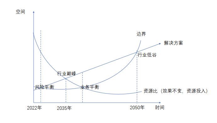 以当下时点为原点,个人认为,2022年末,行业解决方案对企业网络信息安全的需求尚未达到平衡阶段,尚不能解决企业认知的网络信息安全边界的需求。在3-5年内,随着行业解决方案的发展,会达到企业当下认知水平的网络安全边界与解决方案的平衡,企业进入认知水平的风险平衡状态。